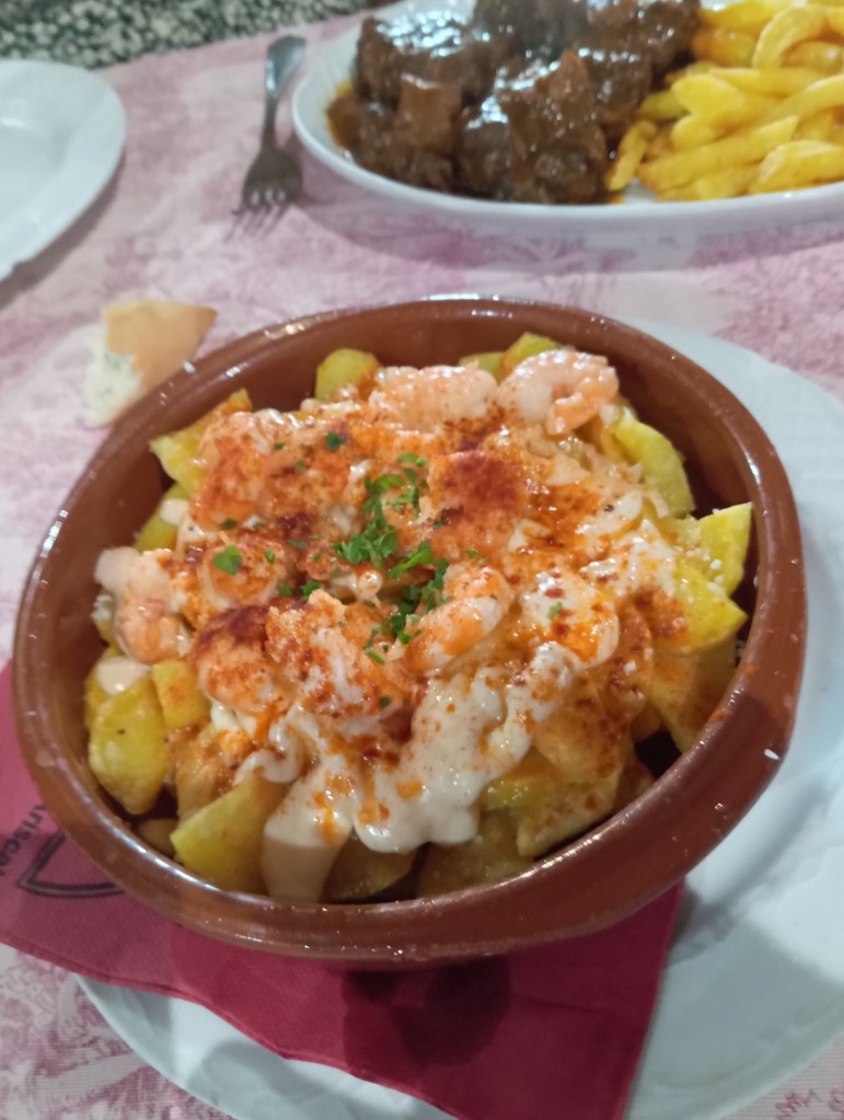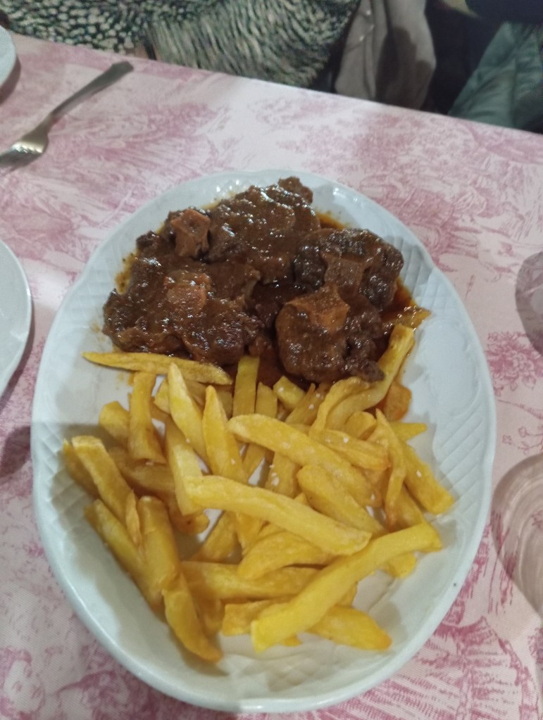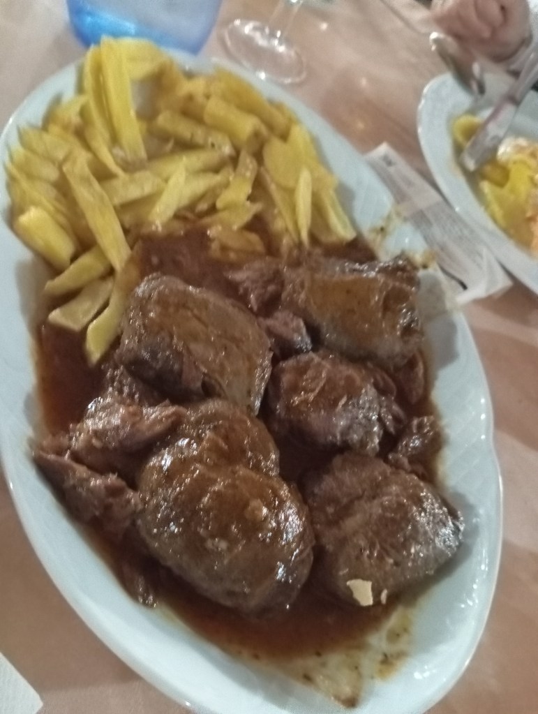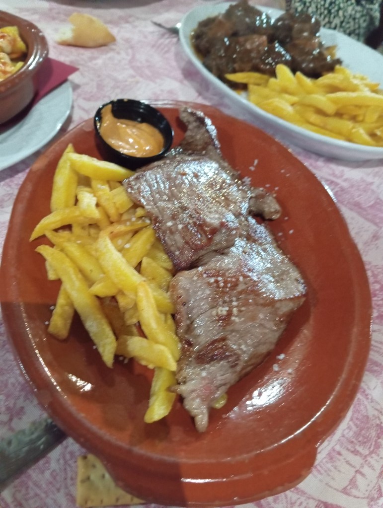 La comida es casera y sin pretensiones. Comida de toda la vida. Carrillá, croquetas, bacalao dorado, patatas al potro (con alioli casero, muy bueno), arroz con carrillá, con cola de toro, carnes… y si quieres unos huevos fritos, pues también.