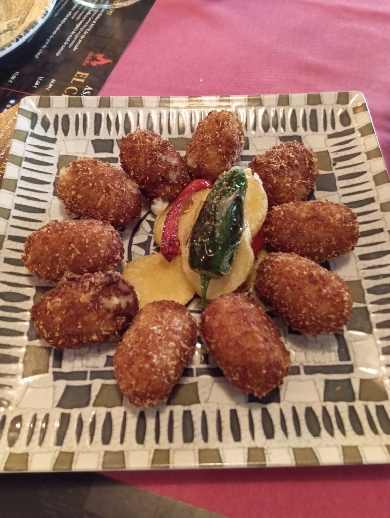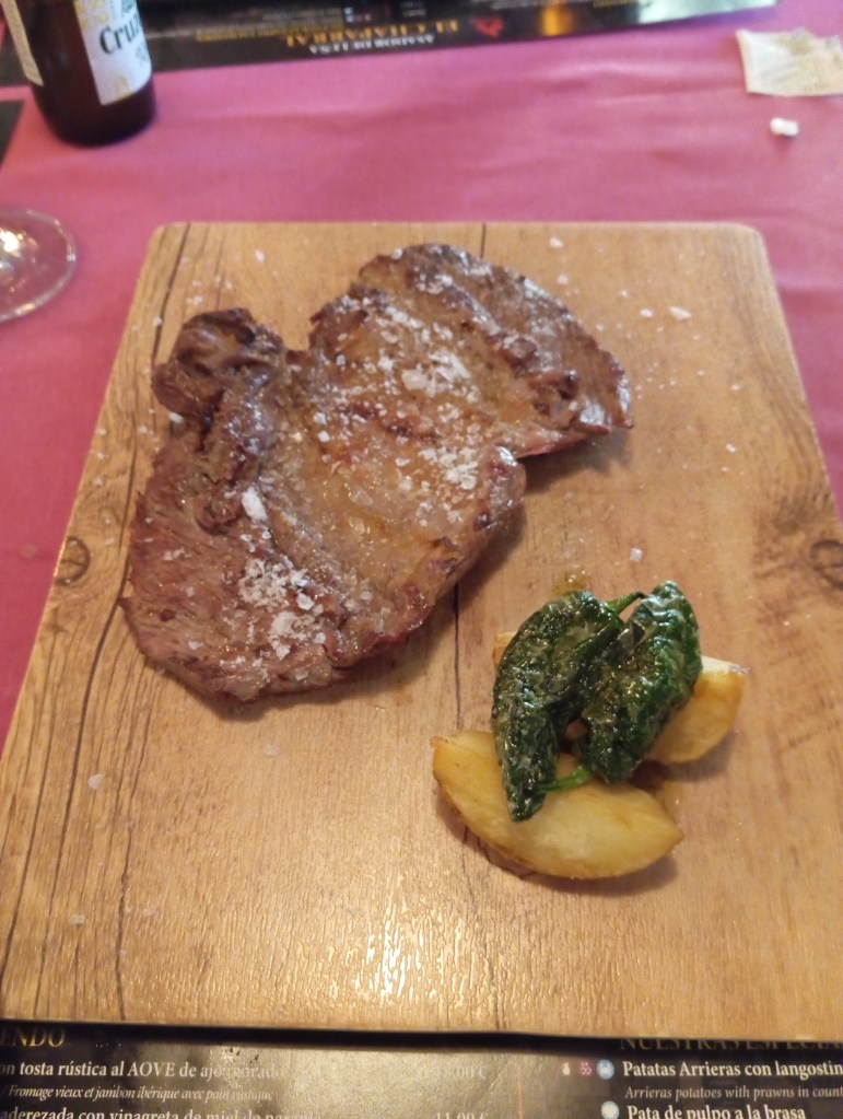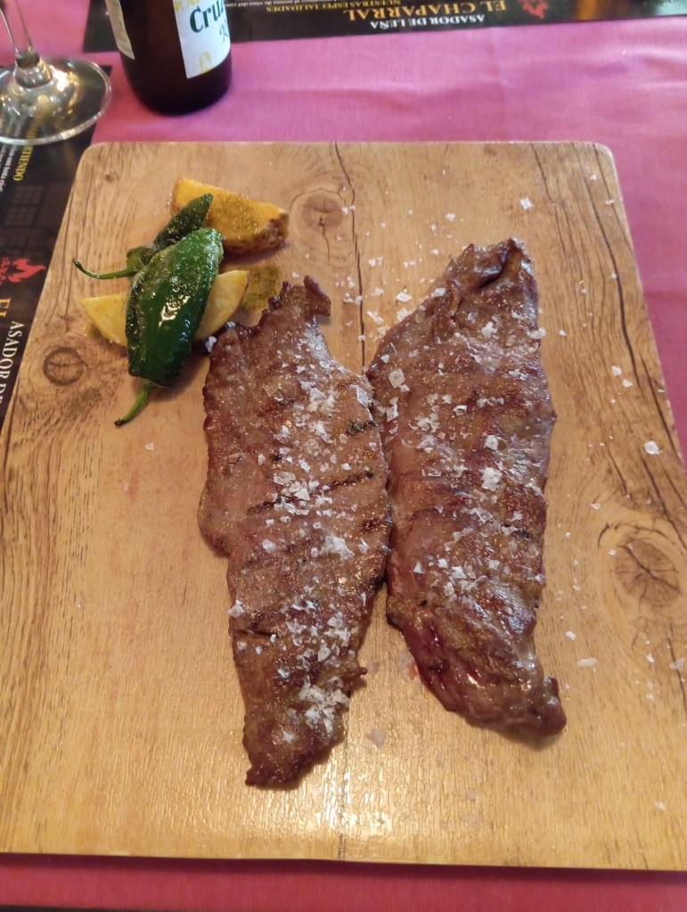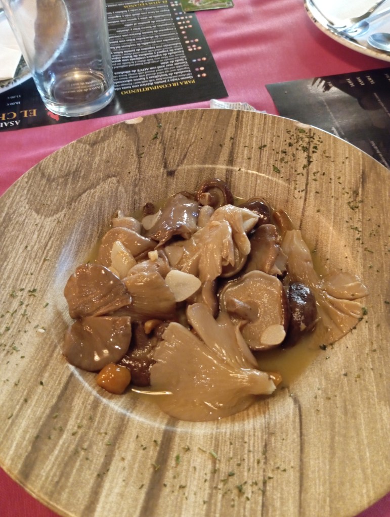 Vamos a la comida y a mi experiencia. No es agradable tener que decir esto pero no salí nada contento de allí. Los entrantes estuvieron bien. Croquetas y salteado de setas. Más que aceptables. El problema vino después. Pedimos tres carnes diferentes. Era un asador. La calidad y la elaboración de la misma me pareció muy negativa. Carne sin ningún sabor y con la dichosa manía, que afortunadamente se ve cada vez menos, de aderezar la carne con una excesiva capa de escamas de sal. No hablaré del problema que tendría un hipertenso con esto, pero si la carne tuviera un gran sabor, que no era el caso, éste quedaría totalmente enmascarado con las montañas de sal. Pero bueno, el problema de la carne no era precisamente la sal.