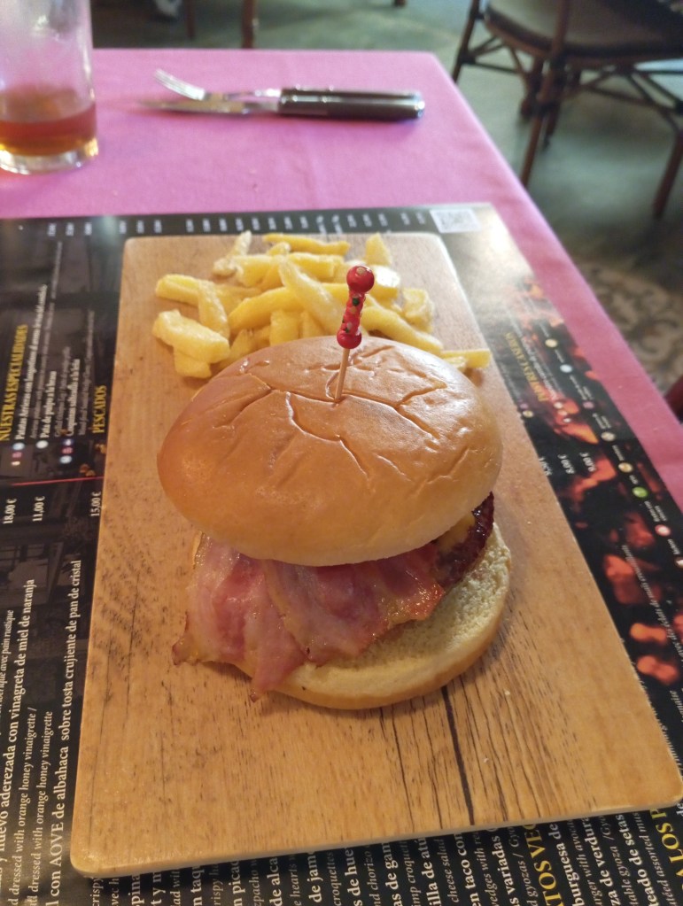 Restaurante a pie de carretera en Carrión de los Céspedes. Fácil acceso y aparcamiento propio. Restaurante asador con decoración moderna y parrilla a la vista. Eso debería ser un plus. Dispone de un salón grande y bien acondicionado y un salón privado con varias mesas… y una armadura. Camareros suficientes para el local, atentos y aparentemente bien organizados (con pinganillos).