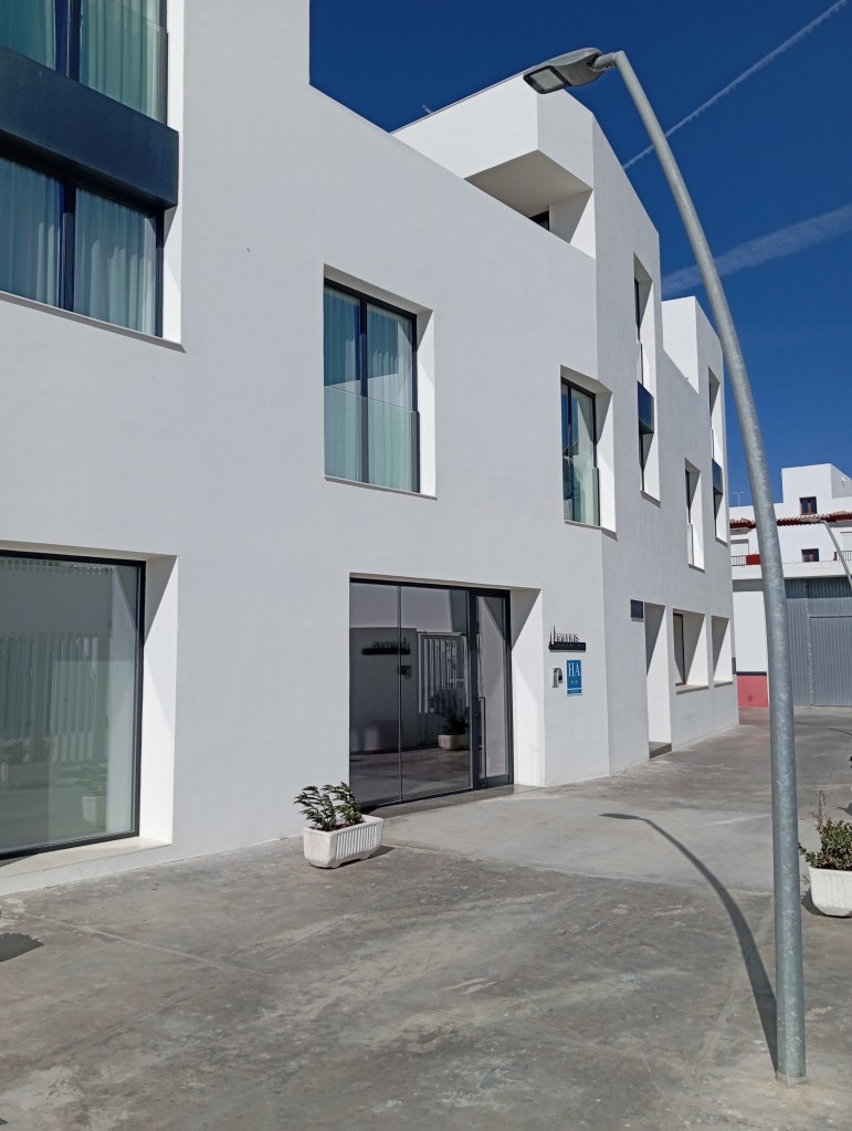 Apartamentos en la zona de entrada de Conil de la Frontera. Es una construcción totalmente nueva. Edificación de estilo vanguardista que contrasta con el aspecto tradicional y el ambiente de pueblo de Conil. Pero vanguardista para bien.
