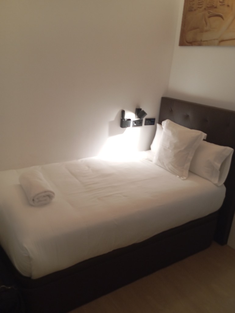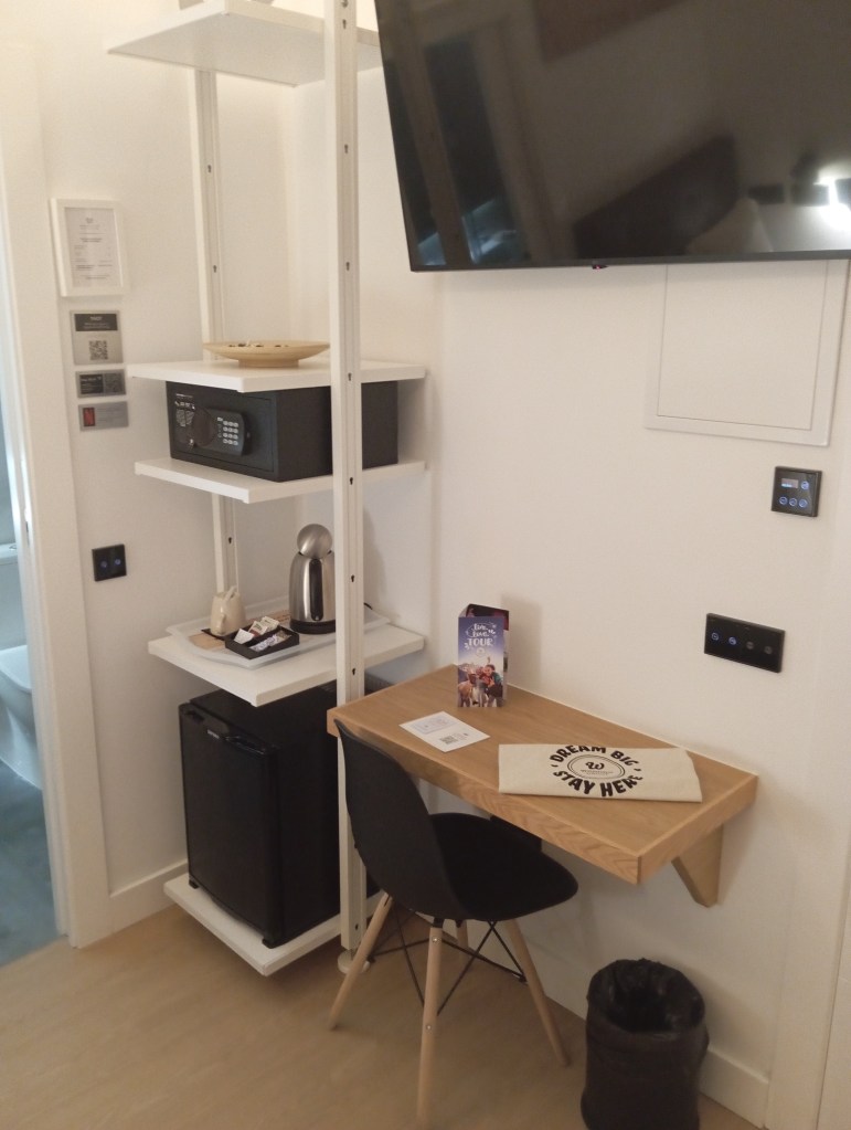 Las habitaciones están en la primera planta de un edificio de varias plantas. Junto a Gran Vía, en la calle Silva. Más cerca imposible. El edificio es antiguo. Todo cambia al entrar en Woohoo. Reformado y moderno. Hay lo mínimo pero está todo. Al entrar en la habitación te das cuenta de lo que estoy diciendo. Es pequeña, con lo justo, pero no falta de nada. Y además ofrecen Netflix gratis, una pequeña nevera y un calentador de agua para hacer té. Y todo muy moderno. Botones por todos lados. Está bien. Para una estancia corta vale.