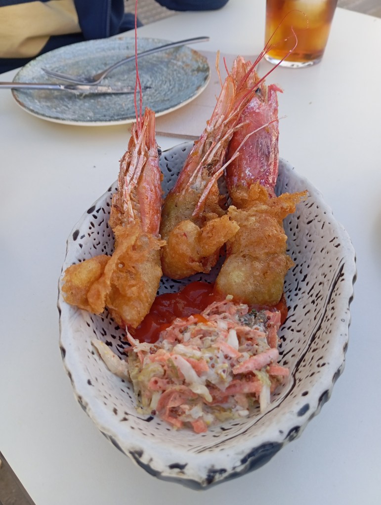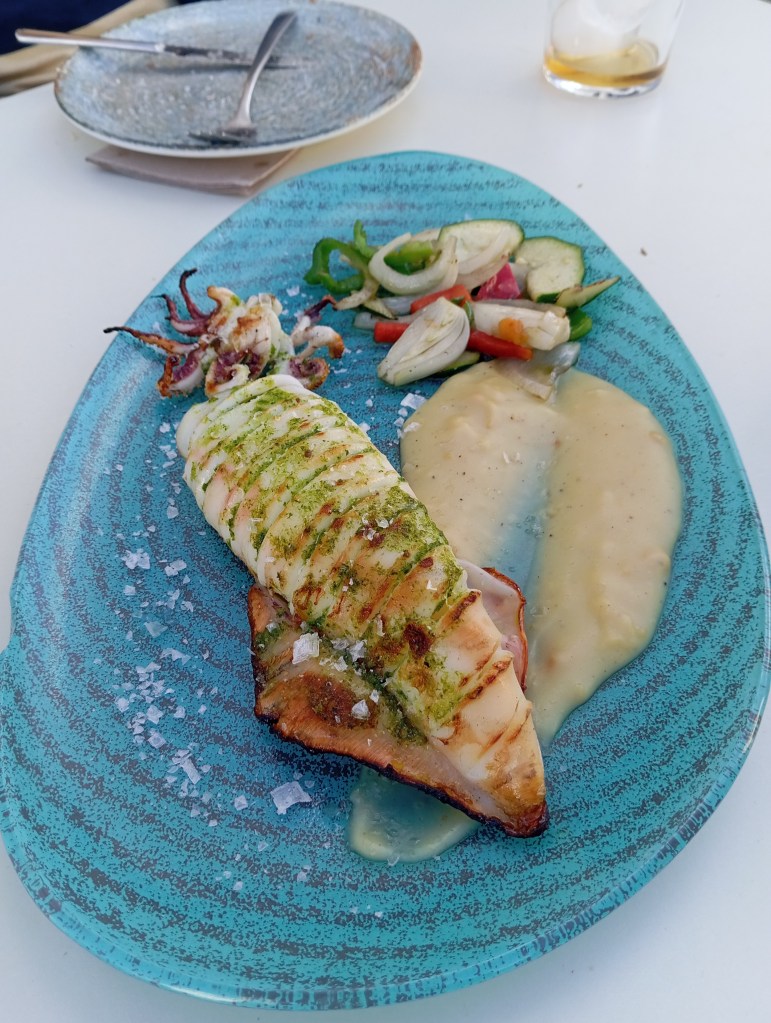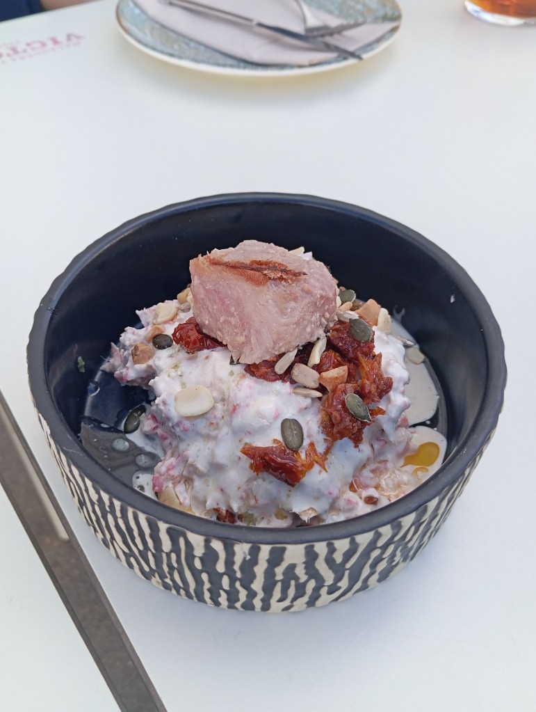 Carta amplia y muy variada. La comida es sencillamente deliciosa. Especialistas en atún rojo y arroces, el cliente puede degustar también platos como ensaladilla Zeppelin, pavía de gambón, pulpo, calamar plancha o frito o unas excelentes carnes. Las croquetas de puchero… las mejores que he comido en los últimos años. Además tienen recomendaciones semanales. Me quedé con ganas de probar más platos. Toda la carta, vamos.