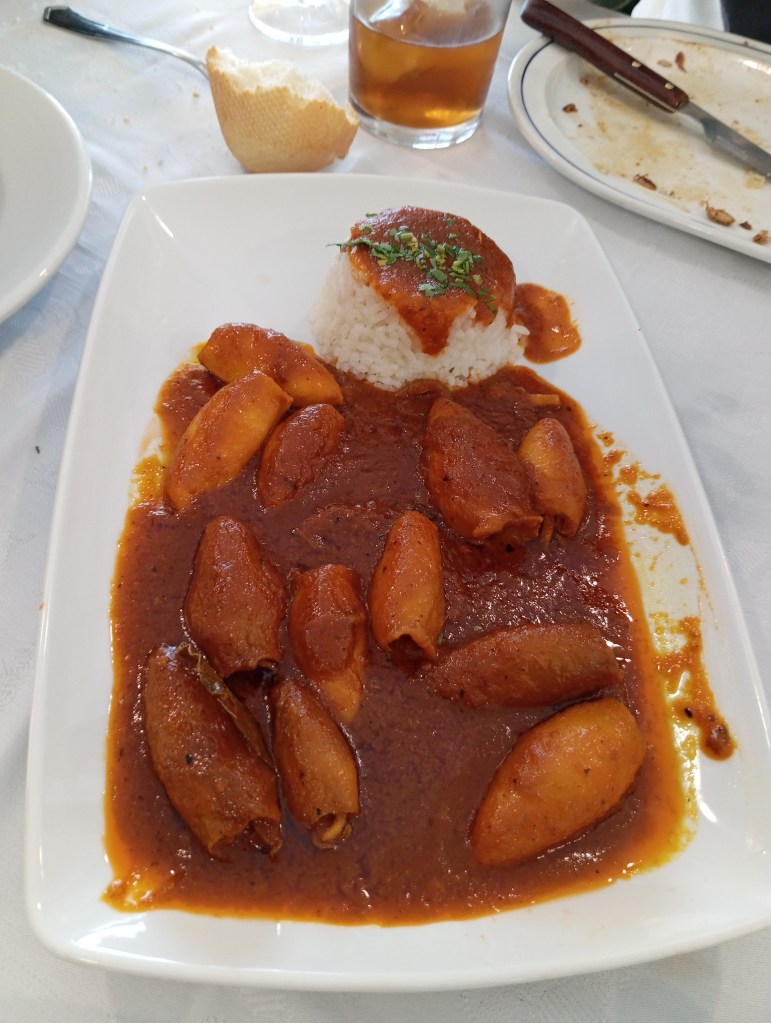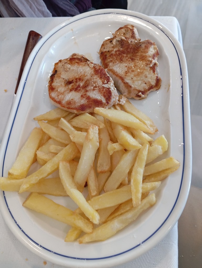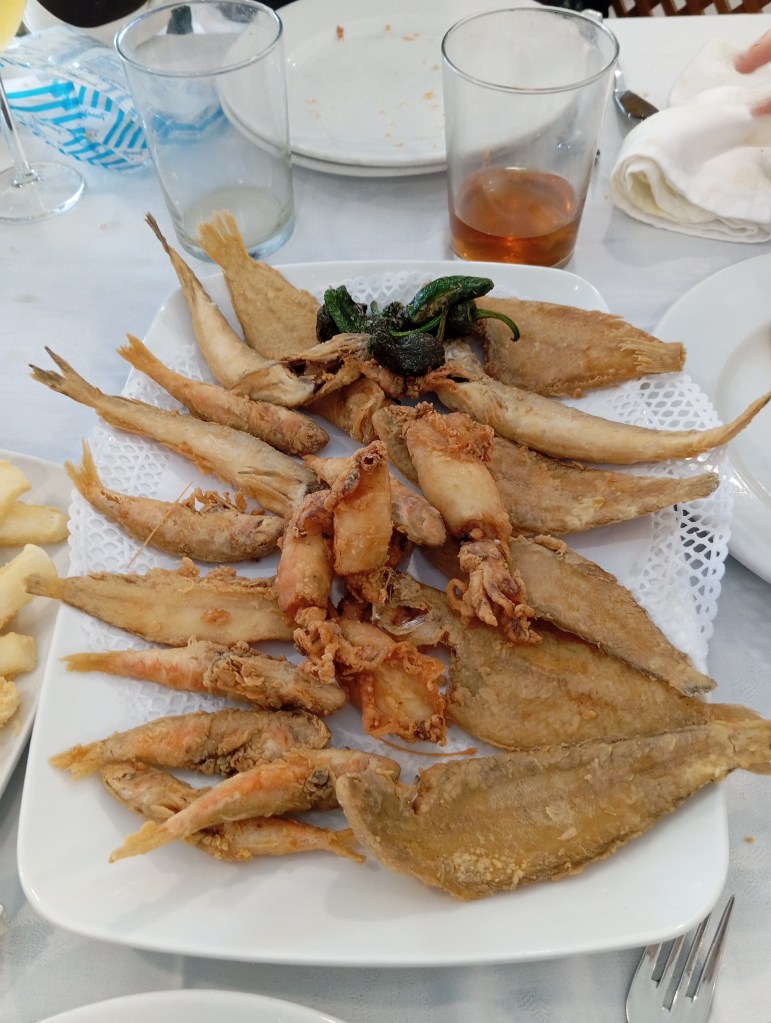 La carta es amplia y marinera. Digo esto para que no esperen una gran variedad de carnes. No la hay. Estamos en Sanlúcar. Langostinos de muerte, chipirones en tomate, jamón, corvina, rape, arroces y fideos con langostinos, coquinas, pescados fritos… y papas aliñás. ¡Qué papas aliñás! Las pido siempre.