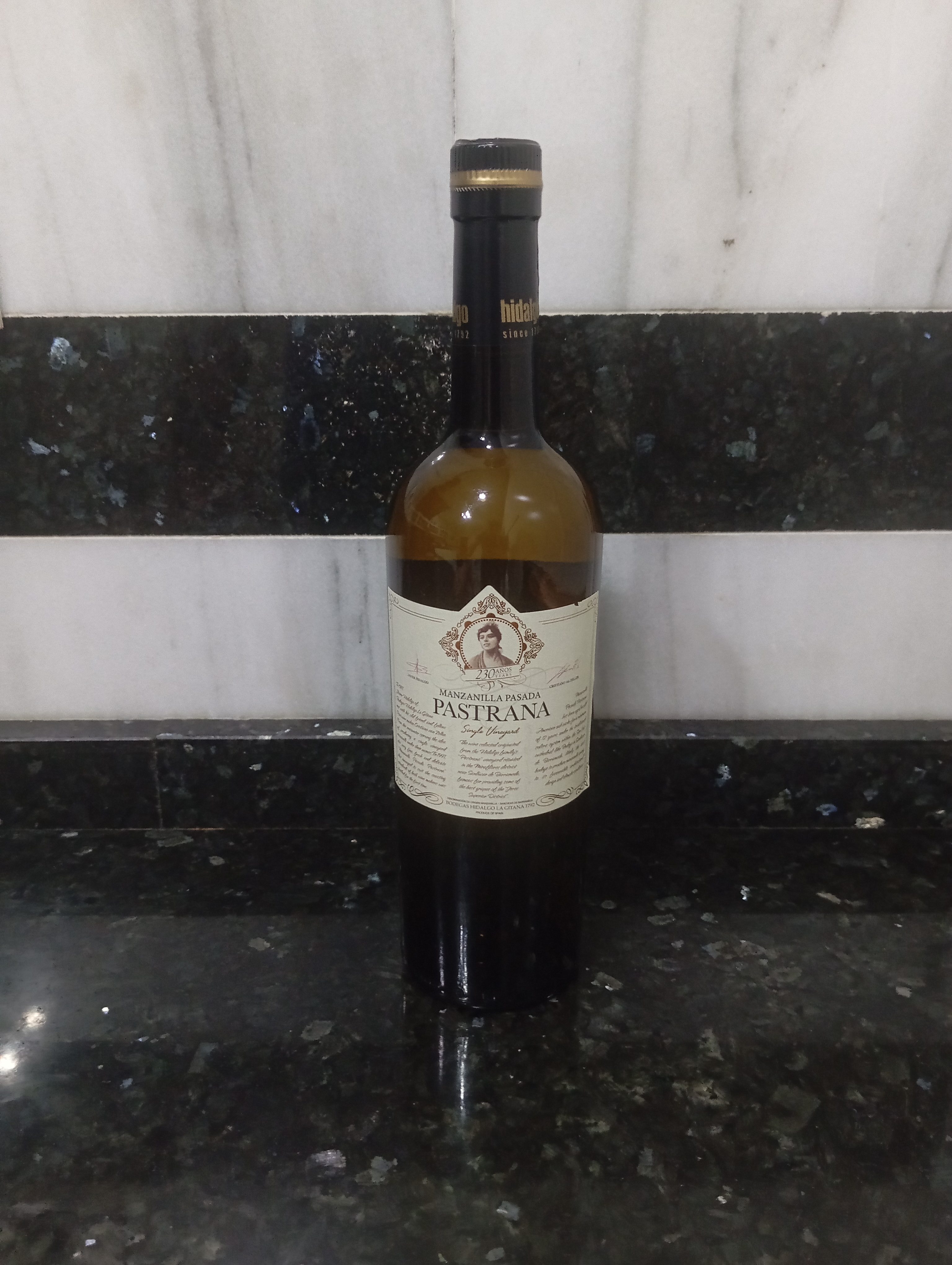Manzanilla pasada elaborada por Bodegas Hidalgo La Gitana. Según la bodega: Pastrana nace en 1985, cuando Javier Hidalgo pone en marcha junto con su buen amigo Cristiano van Zeller, bodeguero del Douro portugués, un proyecto nuevo, consistente en elaborar un vino totalmente especial, procedente de un único viñedo de calidad excepcional, al estilo Chateau Frances y donde solo y exclusivamente se usarian los vinedos de esta finca para elaborar este sublime vino. (Single Vineyard). El resultado es una manzanilla vieja, pasada, al estilo classico mas puro sin someterse a ningún tipo de filtración ni estabilización por frío, La Reina de las Manzanillas.