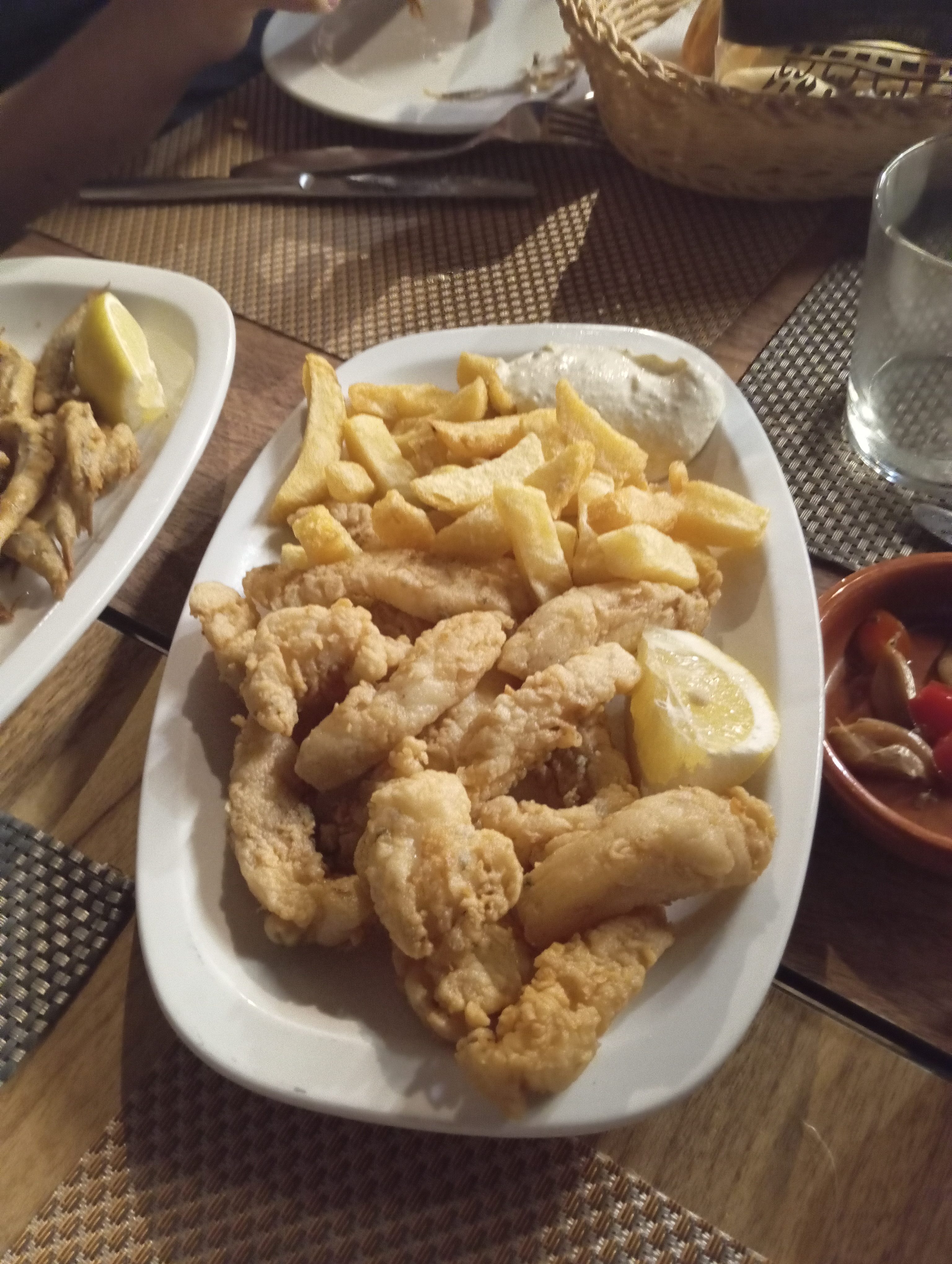 La carta es amplia y muy variada. Ensaladas, carnes, pescado frito, almejas, marisco… todo casero y muy rico. Las raciones, generosas no, lo siguiente. Hay que ir con hambre.