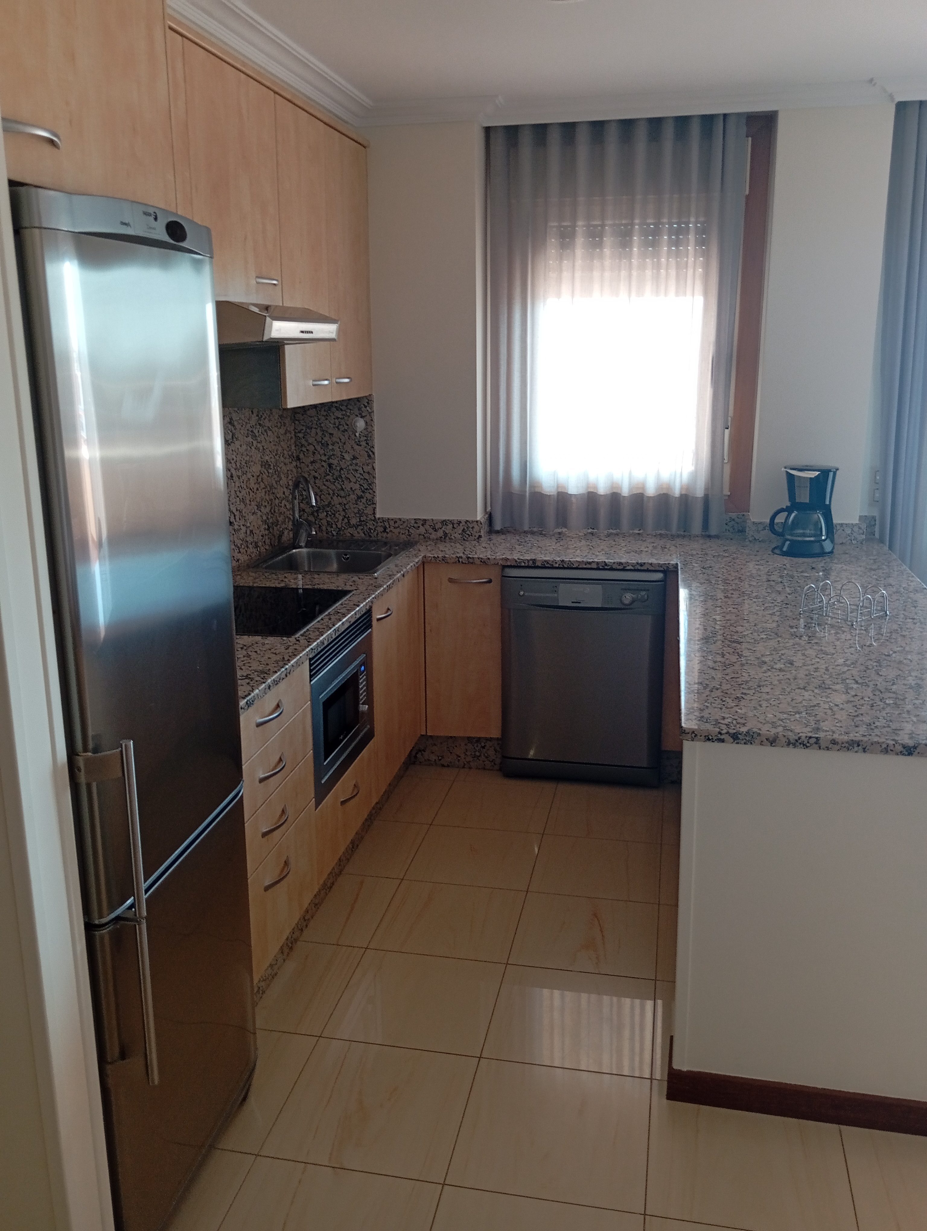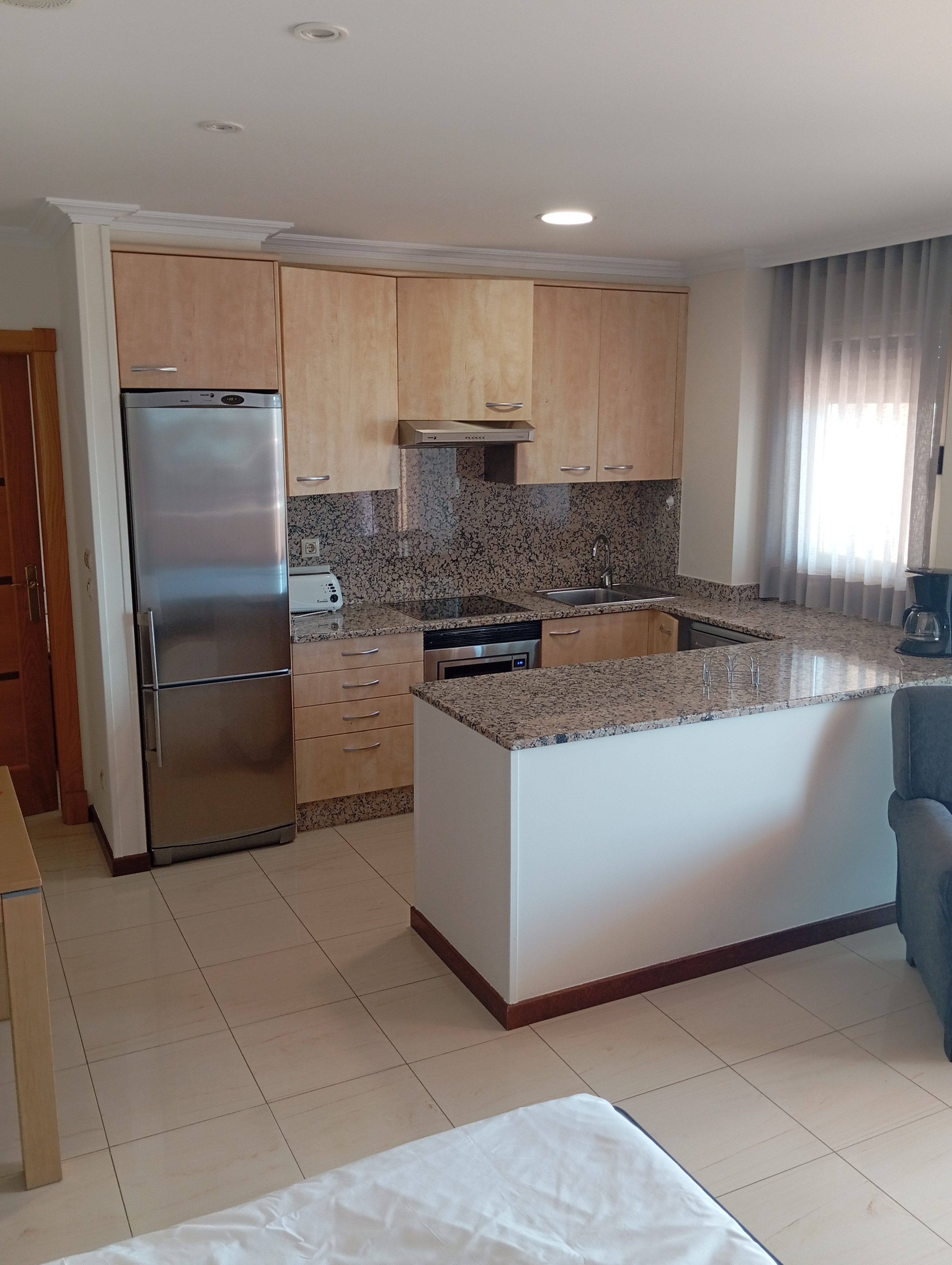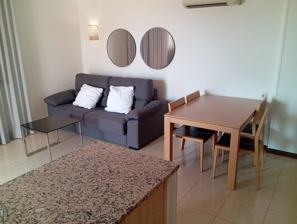 El apartamento estaba bien equipado. Cocina completa, salón, baño y un dormitorio. Y la terraza… Tienen aire acondicionado en el salón y en la habitación y funcionan bastante bien. Todo más que correcto.