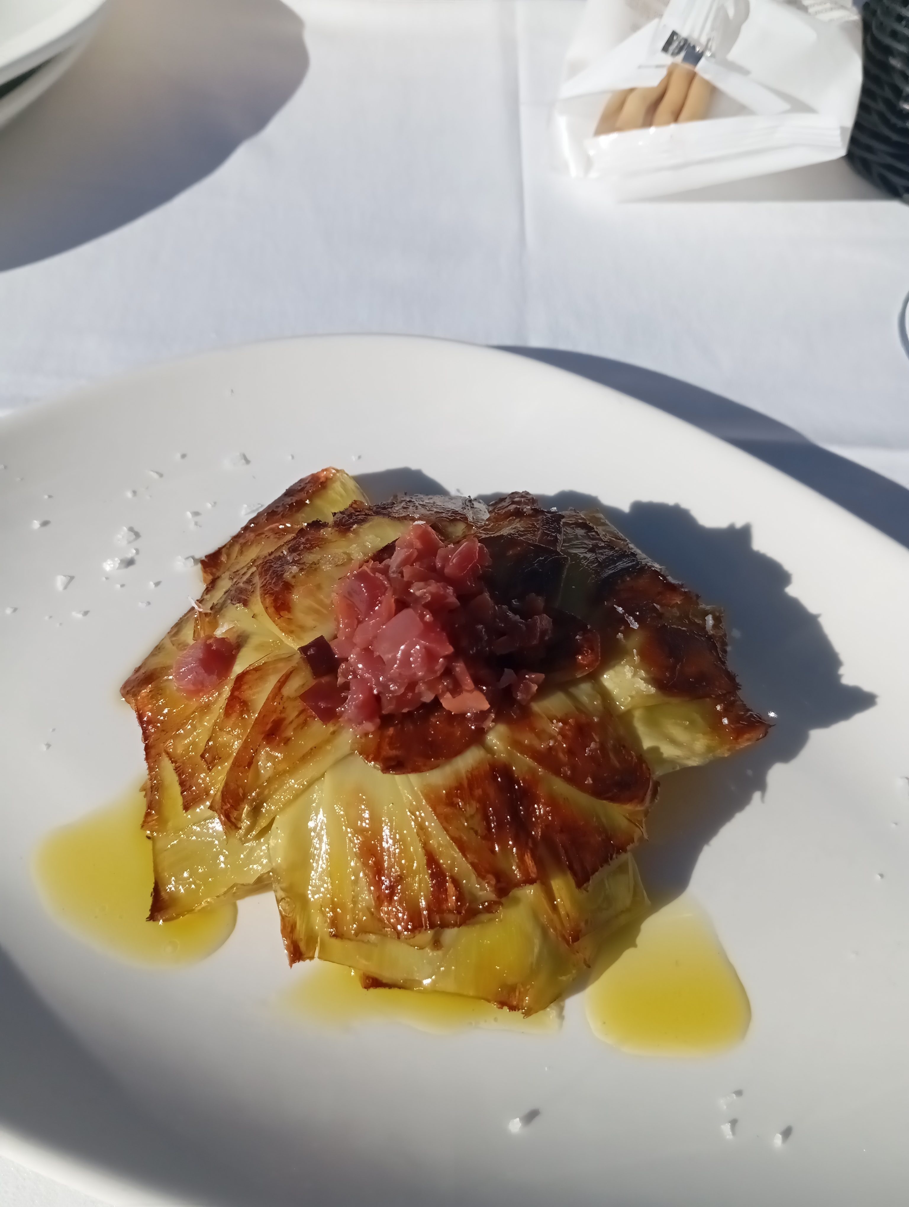 Destacan los fritos de pescado, las carnes premium, el atún fresco, el marisco, el queso Payoyo, los aperitivos fríos y las croquetas. Allí preparan las mejores croquetas de carabinero que he comido nunca. Estoy casi seguro. La alcachofa salteada con jamón era extraordinaria. Con las hojas “quemaítas”…