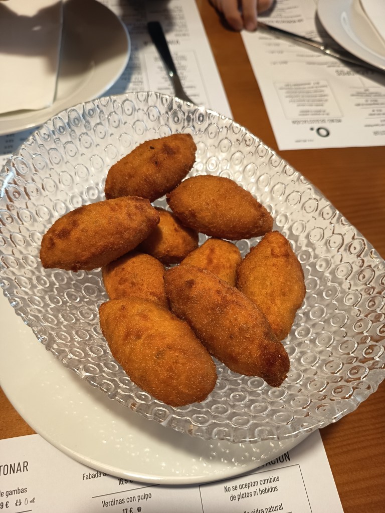 Cocina asturiana, señores. Y mediterránea, para que nadie se quede fuera. Oferta gastronómica muy interesante. Como entrantes, por ejemplo, un surtido de quesos asturianos o un chorizo a la sidra. Croquetas de compango… ¡Oooh!, ¡Qué buenas! Seguimos con una fabada o unas verdinas con pulpo o langostinos al ajillo. ¿Suena bien? Pues todavía queda más. Mejillones, vieiras al horno, carnes… y un cachopo para tocar el cielo. Hay cuatro diferentes para elegir. El de cecina está muy bueno. Y para regar todo esto, surtido de sidras. Ahí es ná.